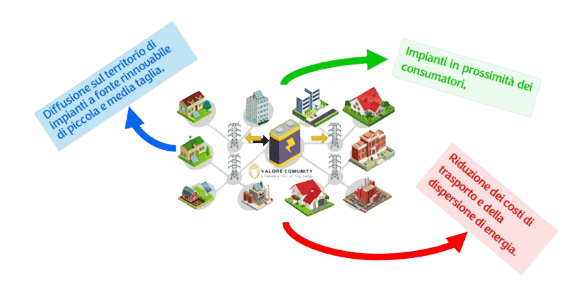 Le Comunità di Energia Rinnovabile (CER) contribuiscono agli obiettivi del Piano Nazionale Integrato per l'Energia e il Clima (PNIEC) riducendo le emissioni di CO2 del 40% rispetto ai livelli del 1990 entro il 2030, aumentando la penetrazione delle fonti di energia rinnovabile (FER) fino a raggiungere il 30% dei Consumi Finali Lordi, e supportando la transizione ecologica ed energetica del Paese in modo significativo. L'autoconsumo generato dalle CER migliora l'efficienza della rete elettrica, riducendo le perdite di trasporto e distribuzione e mitigando gli sbilanciamenti tra domanda e offerta. Inoltre, le CER hanno un impatto economico positivo per i membri attraverso il